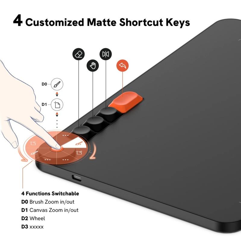 This drawing tablet features an adjustable dial design that allows you to quickly adjust the brush size, hardness, flow, opacity, as well as perform operations such as zooming in, zooming out, and dragging the image around