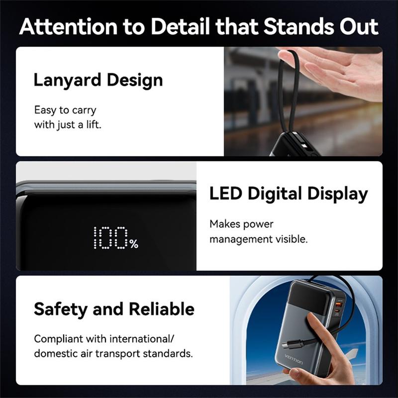 Vention FHYB0 20000mAh Power Bank with Integrated USB-C Cable - Stay Powered Anywhere