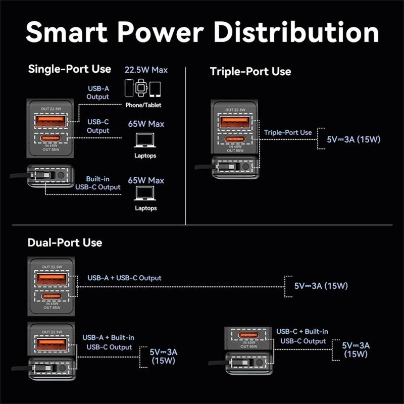 - Max outputs: USB-C 65W; USB-A 22.5 W; built-in cable 65W.