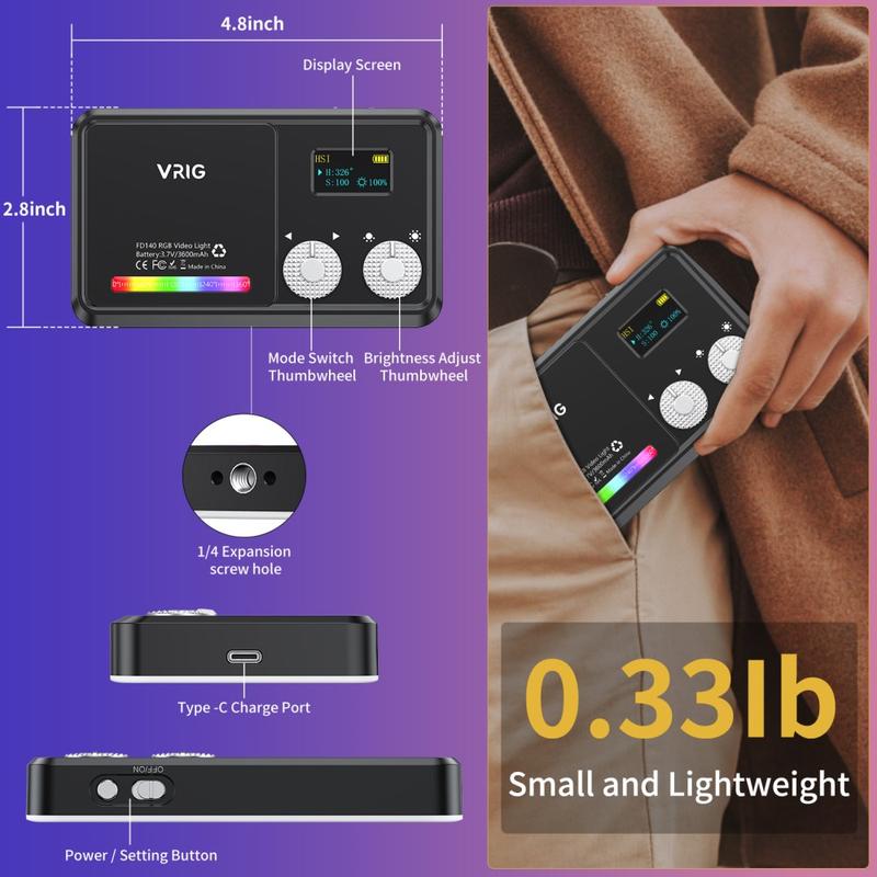 The VRIG FD-98 offers professional lighting quality, full color-temperature control, long battery life and portability in one compact device. It's perfect for creators who want reliable, high-quality illumination without carrying heavy equipment. The combination of CRI 95+, an OLED display and stepless controls gives you creative flexibility usually found in much larger lights.