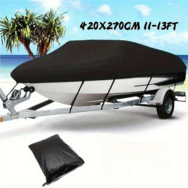 Protect your boat in every season with this durable 210D polyester boat cover featuring a PU coating for dependable protection against rain, sun, dust, and everyday wear. Designed to fit 11-13 ft boats (up to 420 x 270cm), it’s a practical choice for storage, mooring, and transport. The integrated strap system with adjustable belts and quick-release buckles helps keep the cover secure, while double-stitched seams and an elastic hem provide a snug, wind-resistant fit around the hull.