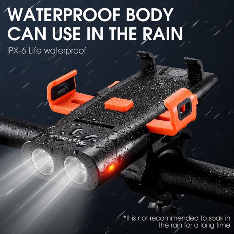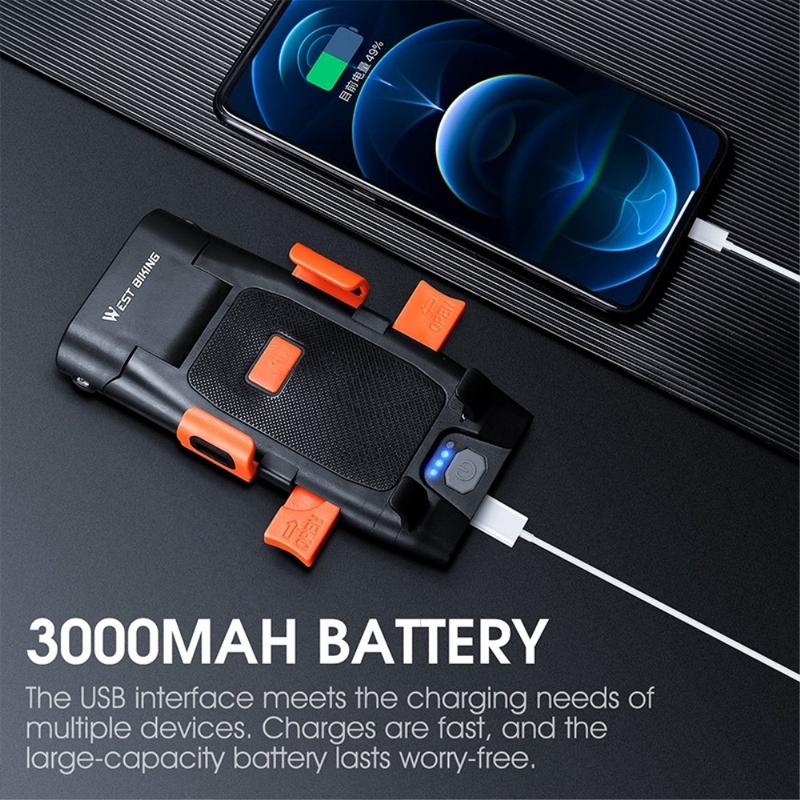 West Biking YP0701321 5-in-1 Bike Front Light with Phone Holder, Power Bank Function, Horn, Warning Light - 3000mAh, 4.5"-6.5"