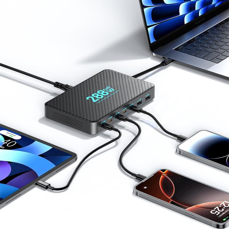 GaN chargers use gallium nitride components that can switch power more efficiently than traditional silicon designs, helping deliver higher wattage in smaller housings. Multi-port GaN stations are popular for reducing cable clutter because they centralise charging and minimise the number of wall plugs needed. Retractable cables also help reduce cable wear and keep workspaces more organised.