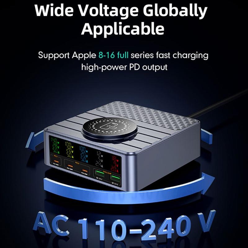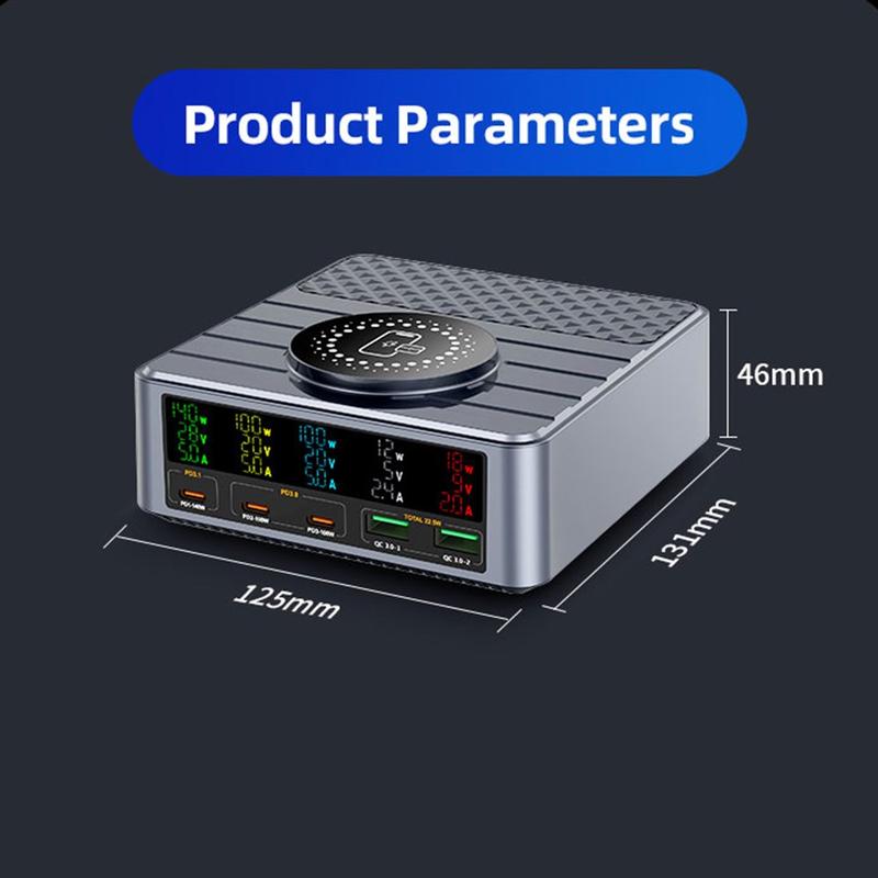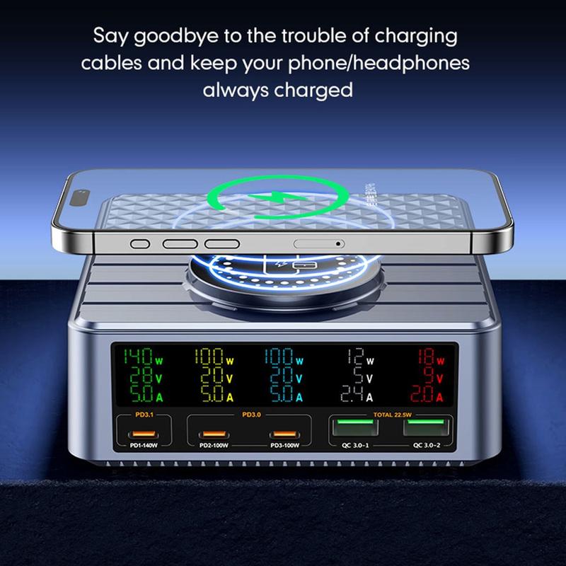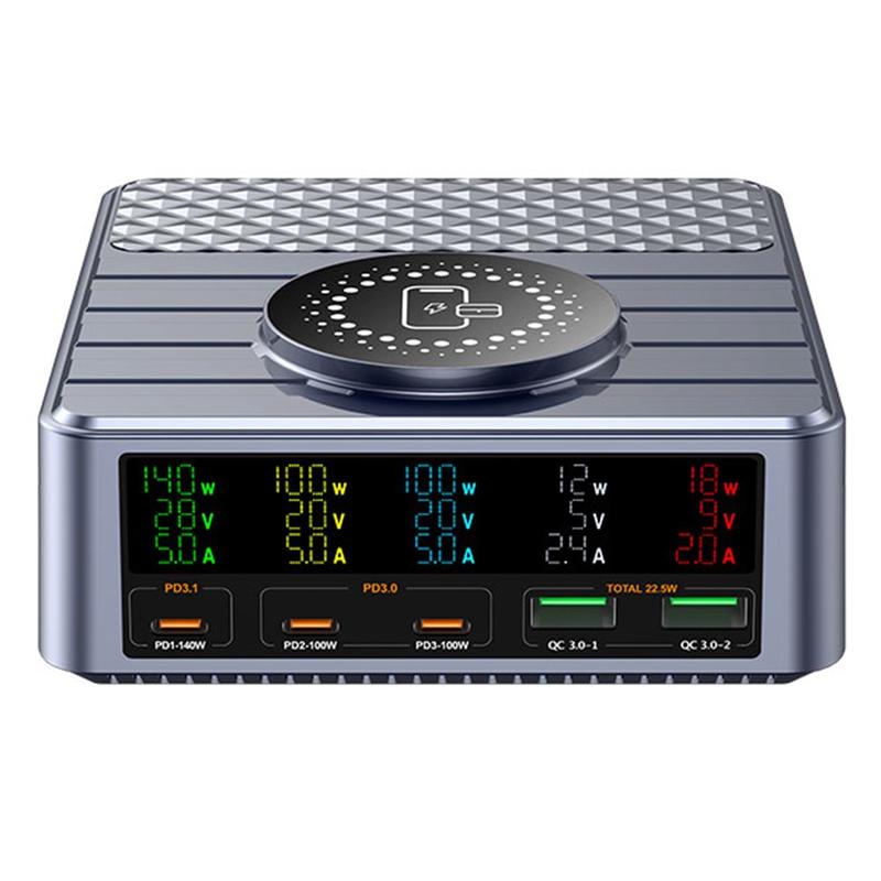 - Six charging ports: 2× PD, 3× QC, 1× wireless charging pad