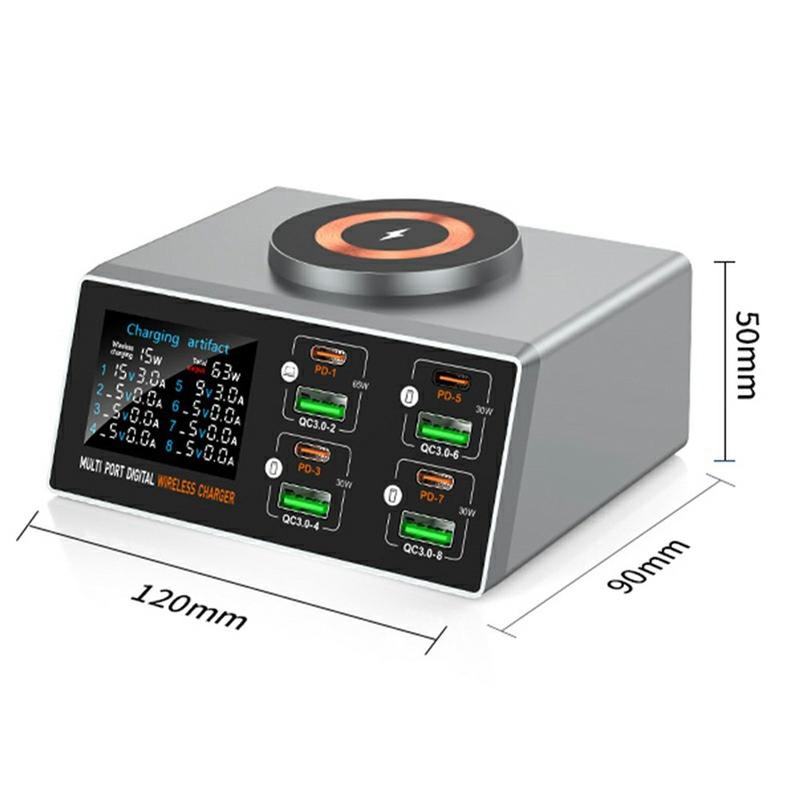 - 9-in-1 charging hub with 8 wired ports + 1 wireless magnetic charger