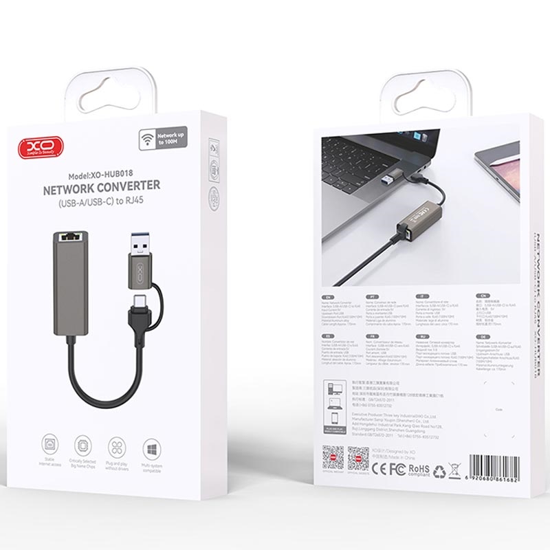 Give every laptop, tablet or mini-PC a rock-solid wired connection in seconds. The XO HUB018 combines both a USB-C plug and a classic USB-A plug on one short pigtail, so it snaps straight into modern Ultrabooks and older notebooks alike. Inside, a fast 10-/100-Mbps controller delivers stable speeds for video calls, large file downloads and low-latency gaming, all without hunting for Wi-Fi. Its pocket-sized housing slips easily into any tech pouch, making reliable internet as portable as your mouse.
