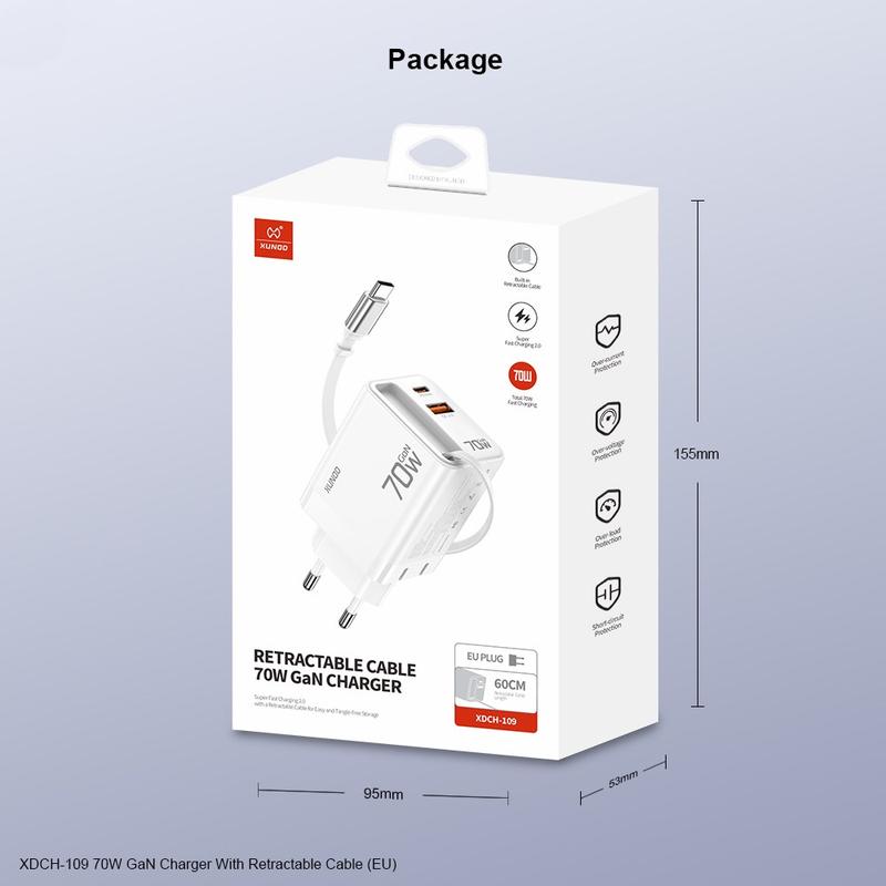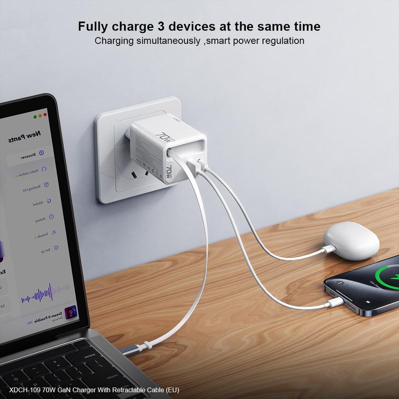 Xundd XDCH-109 70W GaN Fast Charger - EU Plug, Retractable 60 cm USB-C Cable & 3-Port Power Adapter for Laptops, Tablets & Smartphones