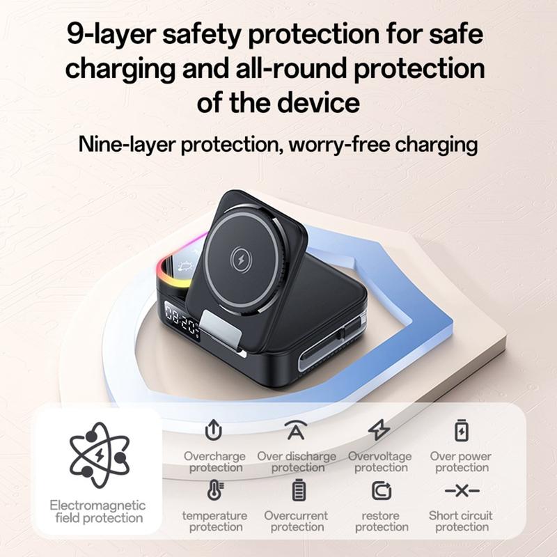 - Magnetic Wireless Charging – Supports 15W / 10W / 7.5W / 5W wireless charging for smartphones, 5W for earbuds, and 2.5W for smartwatches with magnetic alignment for secure placement.
