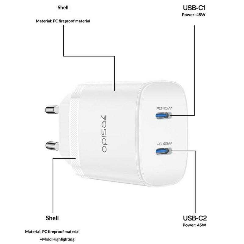 Power up two devices at once with the Yesido YC109 45W dual USB-C PD charger set, designed for fast, efficient charging at home, at work, or in your travel bag. With 45W maximum output and modern PPS (Programmable Power Supply) support, it can deliver optimised charging for compatible smartphones, tablets, and other USB-C devices—helping speed up top-ups while managing power intelligently. Two USB-C ports let you charge multiple devices simultaneously, and the included USB-C to USB-C cable means you re ready to go straight out of the box. The compact wall adapter supports AC 100-240V input, making it a practical choice for frequent travellers, and the fire-resistant housing adds everyday peace of mind.