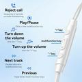 - In-line controls: play/pause, next/previous track, volume, call handling, and 2-second press to reject calls