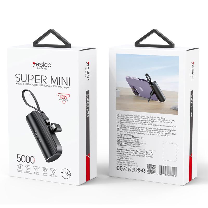 Stay charged wherever you are with the Yesido YP68 Mini Power Bank. With a 5000mAh capacity, this compact power bank includes an Lightning connector and a built-in Type-C cable for convenient charging and a hidden bracket for hands-free use. Lightweight, it’s designed for durability and portability, making it the perfect travel companion for on-the-go charging.