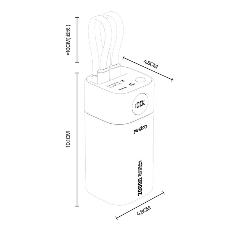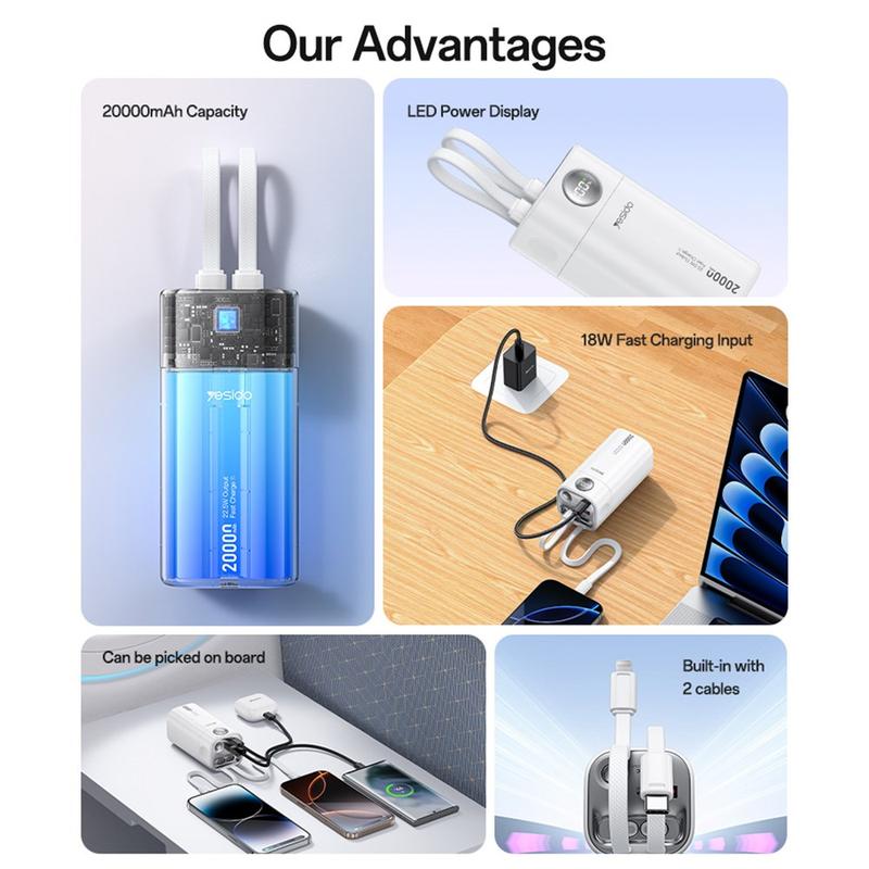 Keep every device topped up on business trips, festivals or daily commutes. The pocket-friendly YESIDO YP86 packs a huge 20000mAh capacity, twin integrated cables and 22.5 W fast-charging power into a durable ABS shell that weighs just 0.36 kg.