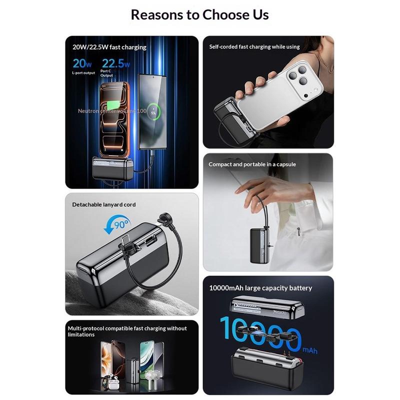 Power banks with built-in cables have become more popular because they make portable charging simpler and reduce cable clutter. Models around 10000mAh are often preferred because they offer a practical balance between capacity and portability. Fast charging support and digital battery displays are also highly valued features, since they help users charge more efficiently and keep better track of remaining power.