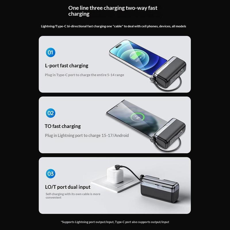 This power bank supports multiple fast charging protocols including PD, QC, AFC, SCP, and FCP, helping it work efficiently with a wide range of devices. It delivers up to 22.5W output through USB-C and up to 20W through USB-L, making it suitable for quickly charging compatible phones, accessories, and other portable electronics. Fast charging can be especially useful when you need a quick top-up during busy days or while on the move.