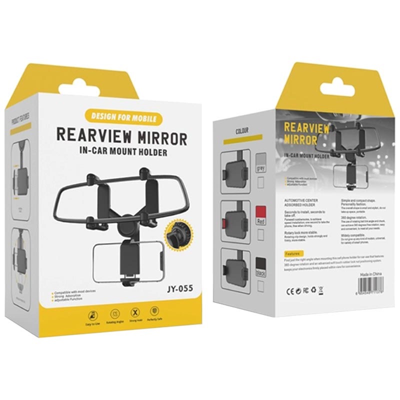 Nastavitelný držák telefonu s funkcí rotující 360 stupňů. Snadná instalace a odstranění připevněte k zrcátku zadního zobrazení a čtyři svorky pevně zamknou na zrcadle. Je vyroben z odolného, pevného a vysoce kvalitního materiálu ABS. Také držák automobilů JY-055 je vhodný pro zařízení v rozmezí od 65 mm do 95 mm.