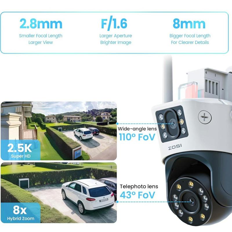 Give every corner of your driveway, garden or shopfront 24/7 protection. The ZOSI C298Pro couples two sharp 8-megapixel lenses with full 355 ° pan / 140 ° tilt movement, so one weather-sealed unit delivers sweeping coverage, razor-detailed close-ups and true-colour night imagery—all streamed straight to your phone in seconds.